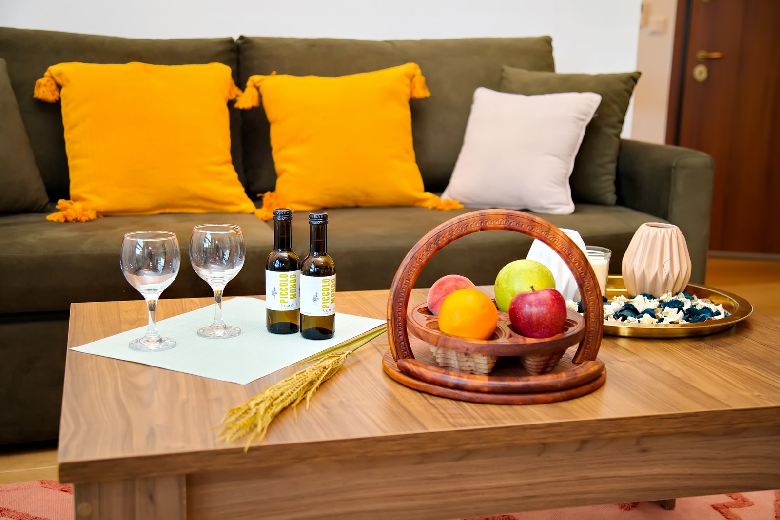 Διακοσμητικά: μαξιλάρια χρωματιστά, ριχτάρια, κεριά ή ρεσώ, δίσκος σερβιρίσματος, χαρτοπετσέτες φαγητού, τραπεζομάντηλο ή σουπλά, ποτήρια κολονάτα και διάφορα βιβλία μυθιστορηματικά ή τουριστικά.